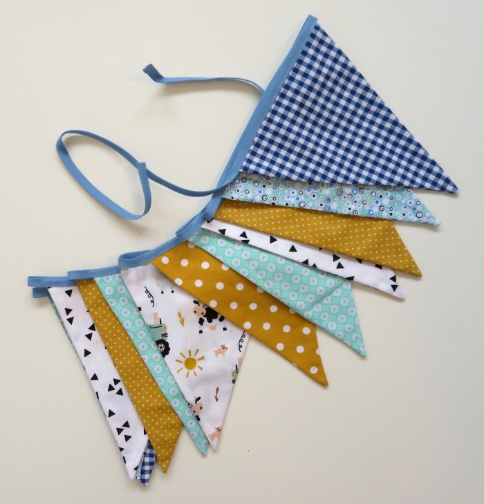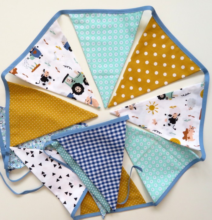 Vlaggenlijn met 13 vlaggetjes waaronder een paar met boerderij figuren.