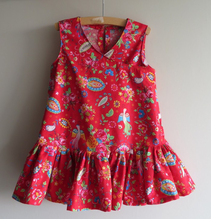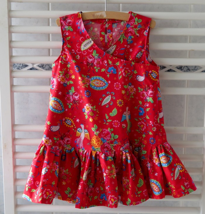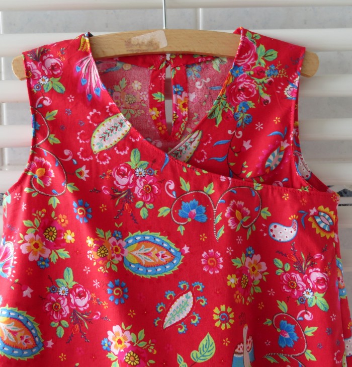 De sluiting van de ruimvallende jurkje is een knoopje in de split aan de achterkant.