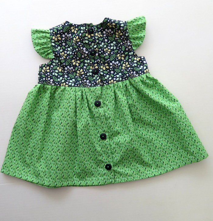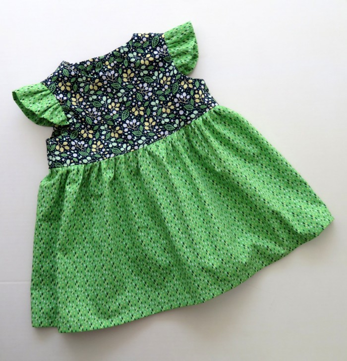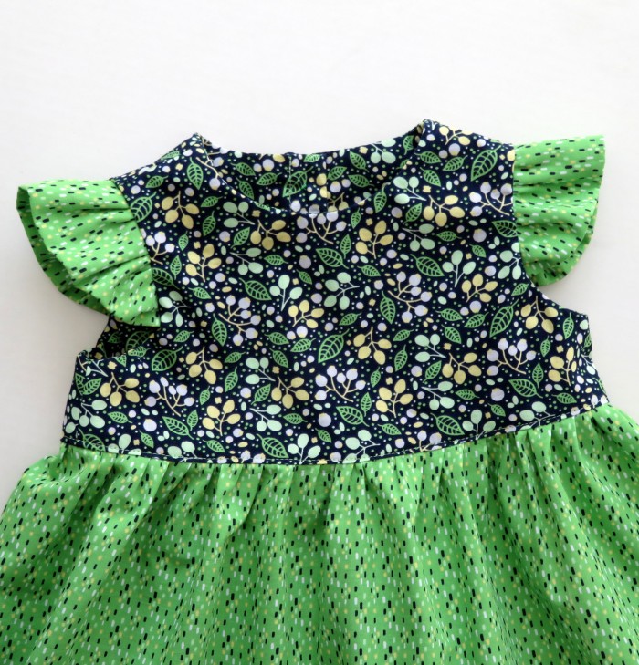 De jurk heeft gevoerde bovenpanden, leuke ruches bij de armsgaten en een wijde gerimpelde rok.