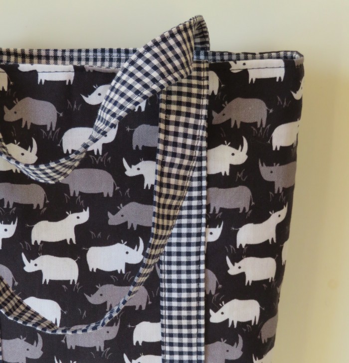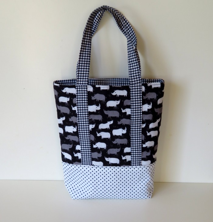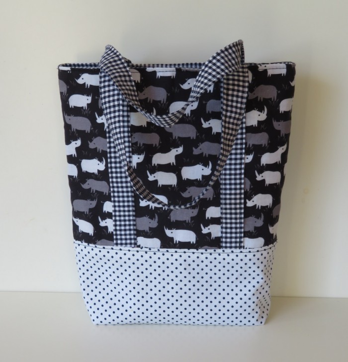 Gevoerd stoffen tasje in zwart wit gemaakt van drie bij elkaar passende stofjes.