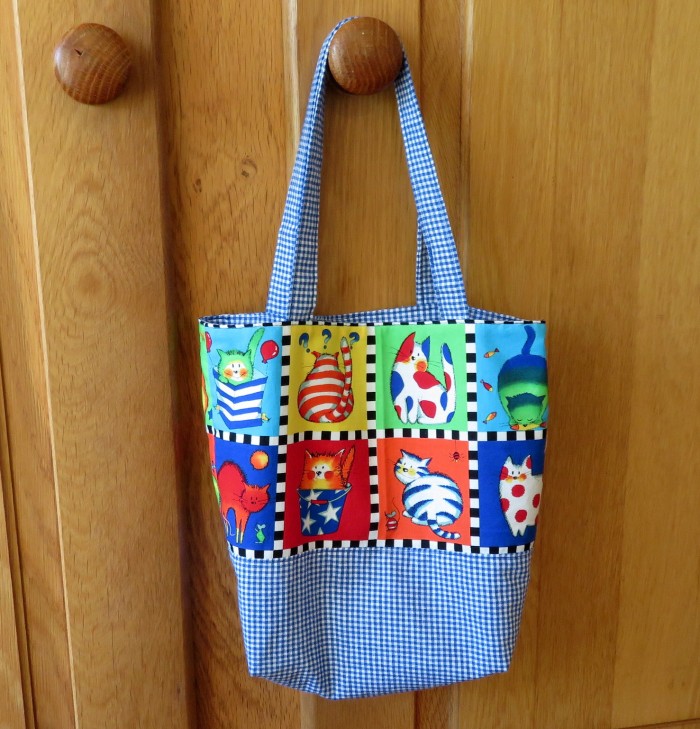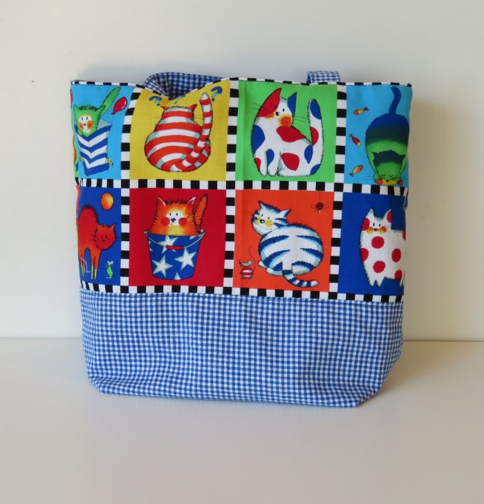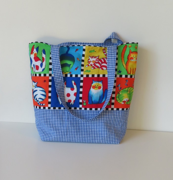 Wat poesjes zoal doen op een dag, dat zie je op dit kleurige tasje van stof.