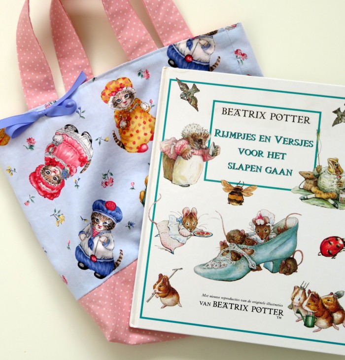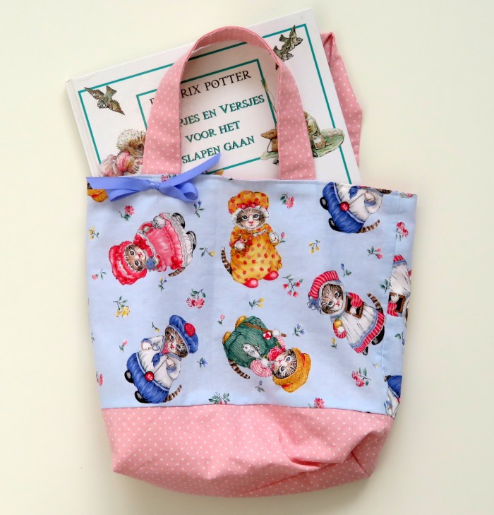 Het handgemaakte gevoerde kindertasje met plaatjes van aangeklede poesjes vind ik er goed bij passen.