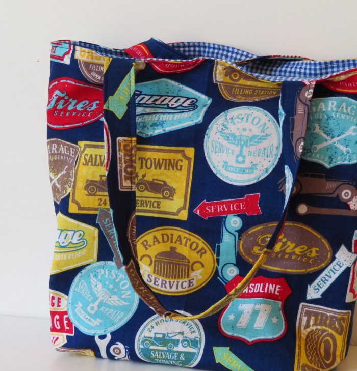 Het tasje is gevoerd met een blauwe ruitjes stof.