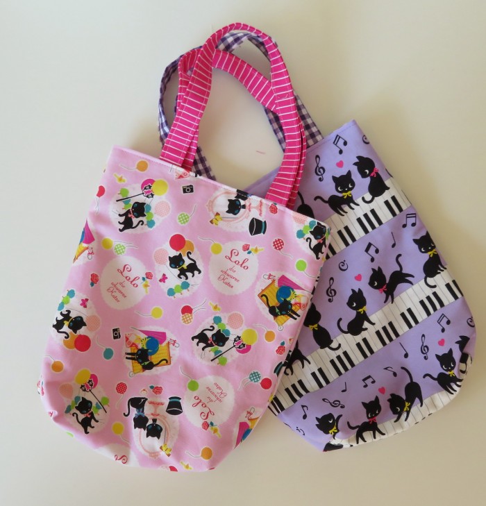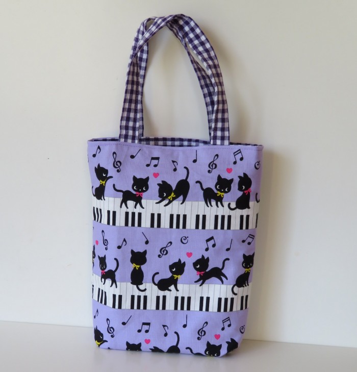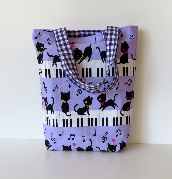 De buitenkant is een stevige katoenen stof met muzikale zwarte katjes op pianotoetsen.