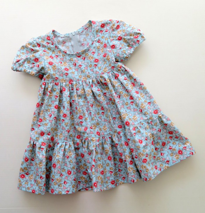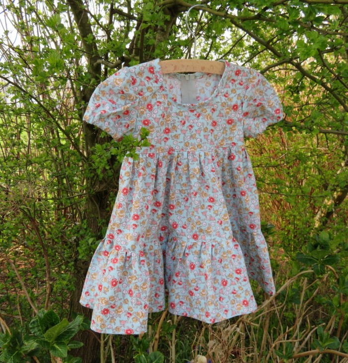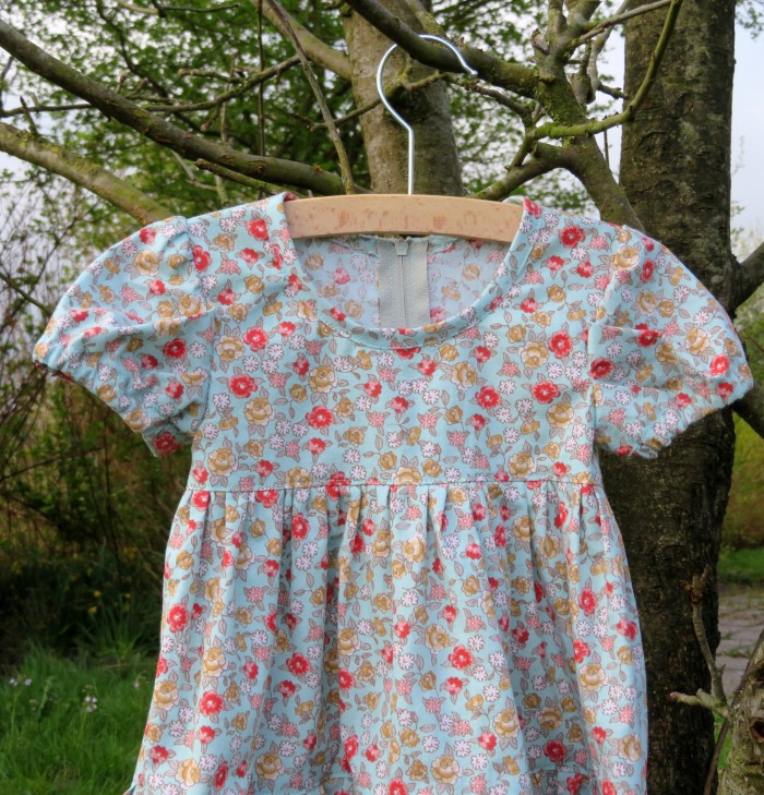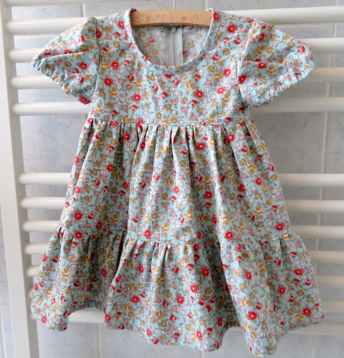Lief bloementjes jurkje met pofmouwen en strokenrok.
