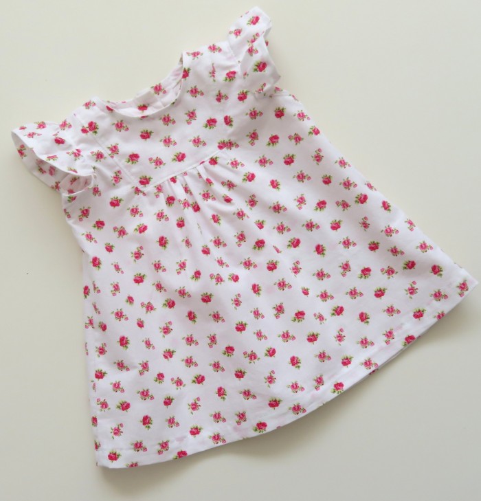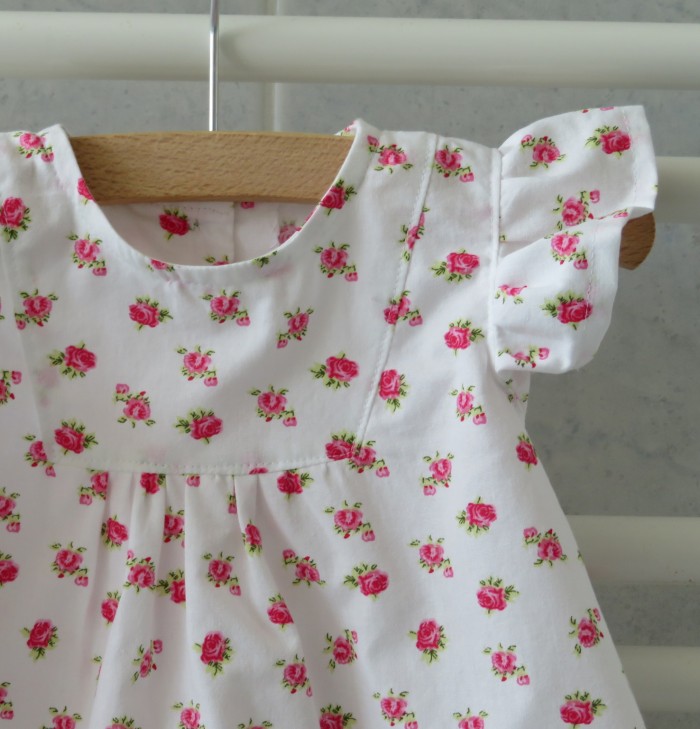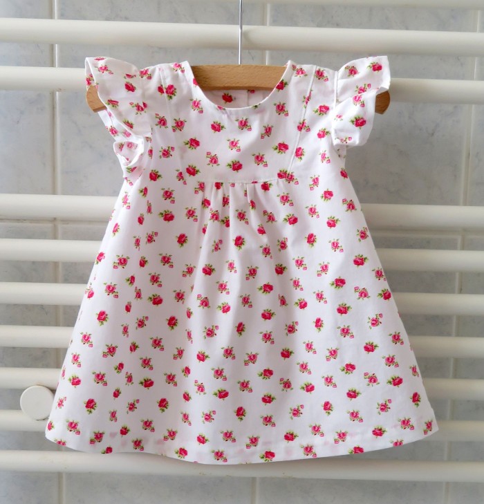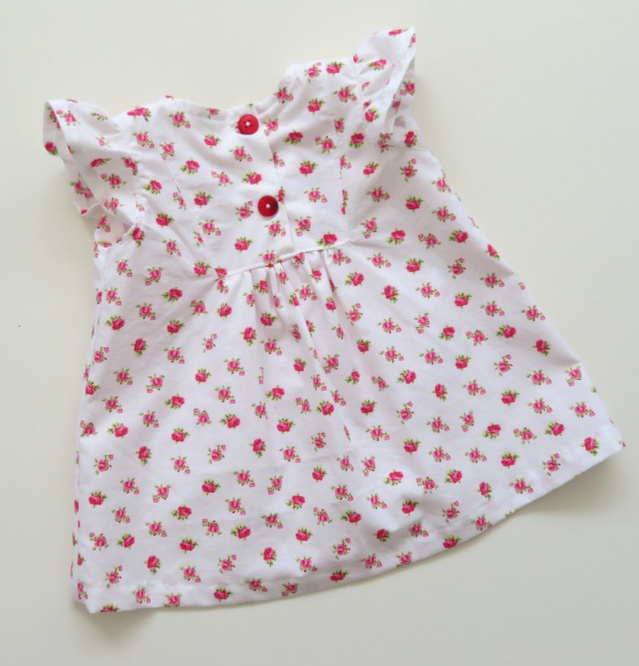 Het jurkje is ongevoerd. Het sluit met twee knopen op de rug.