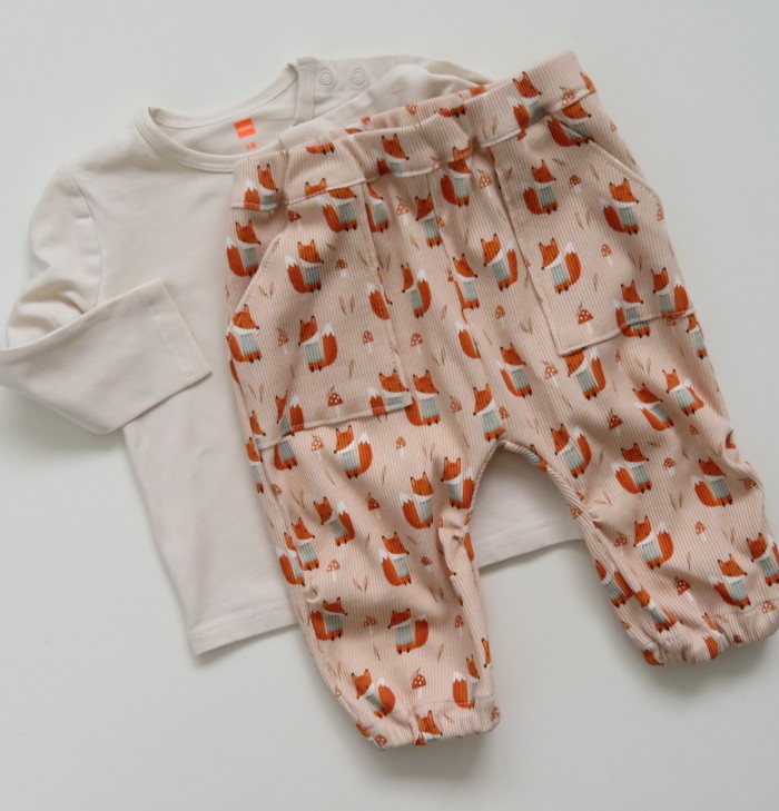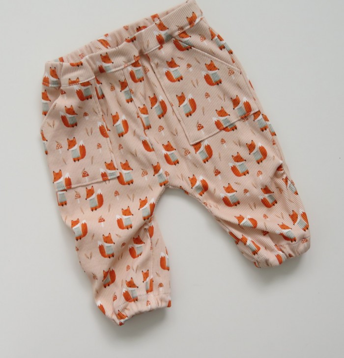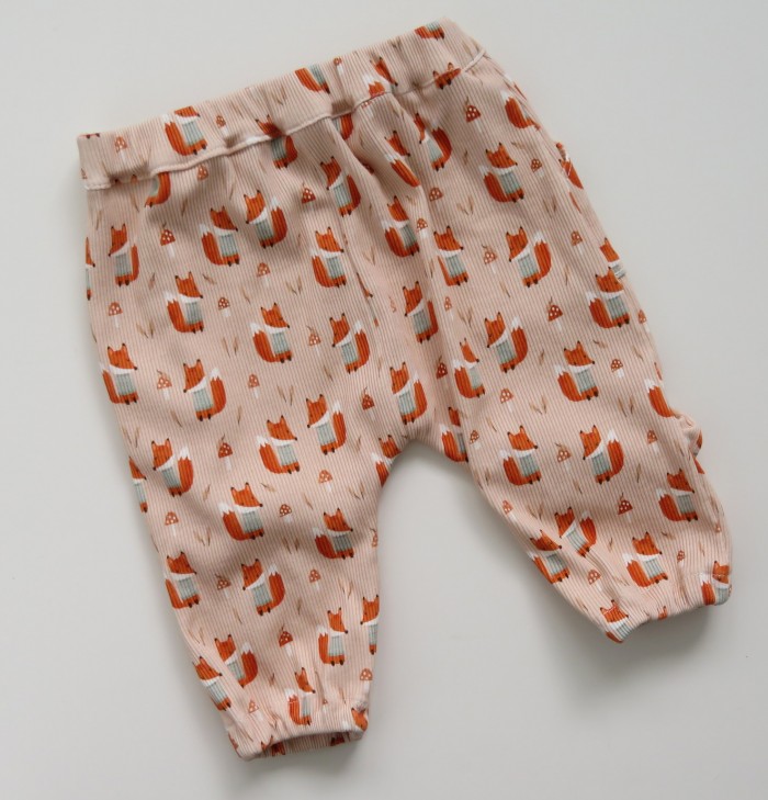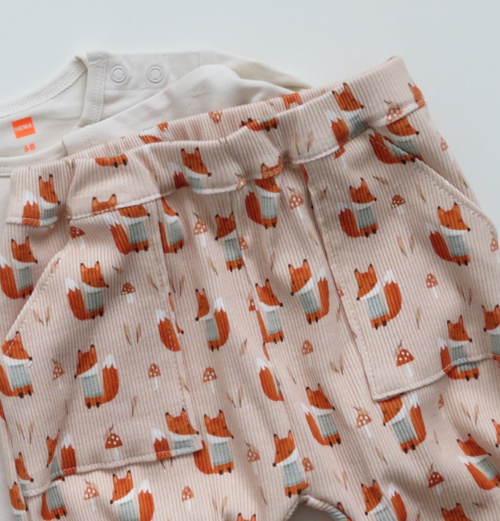 Broekje maat 68 gemaakt van een zachte rib tricot met vosjes print.
