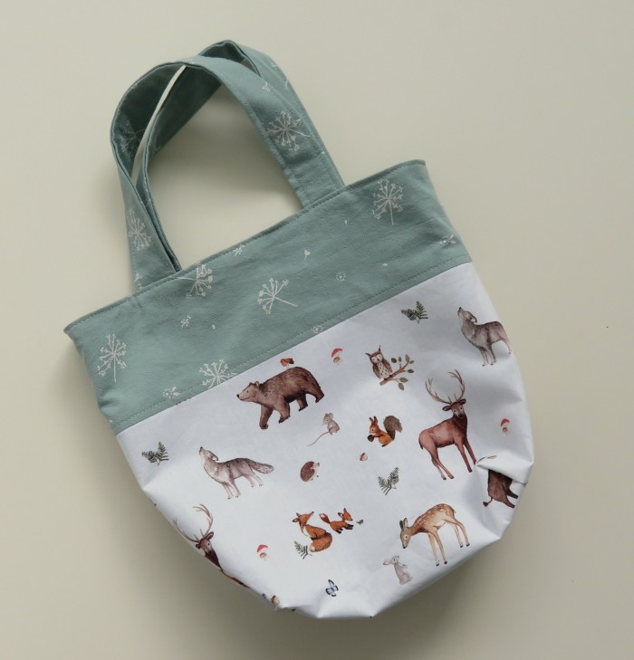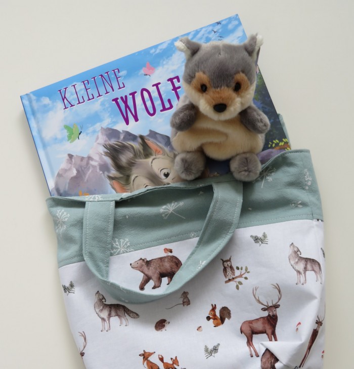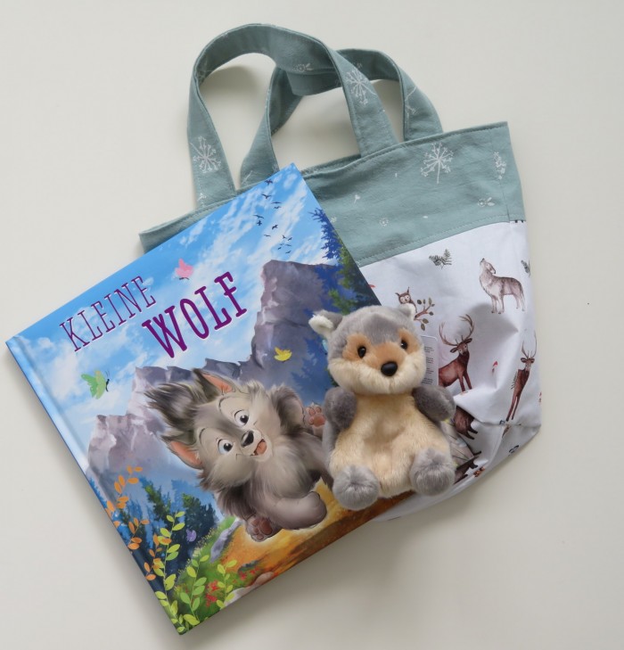 Stoffen cadeau tas met daarin een prentenboek en knuffel wolf.