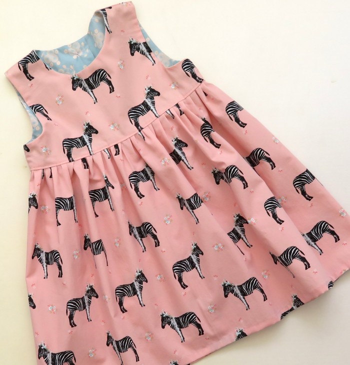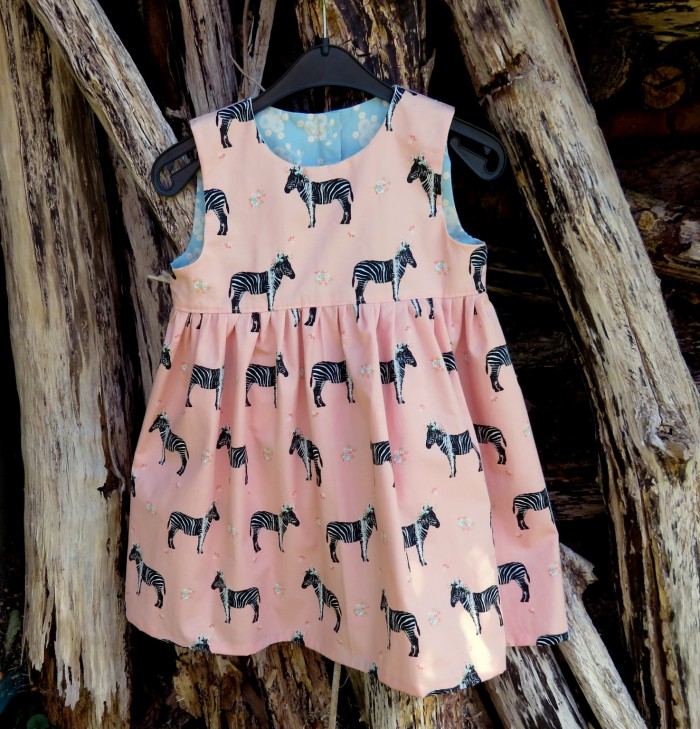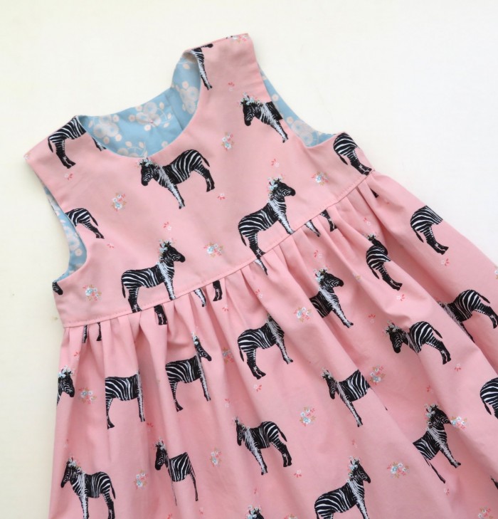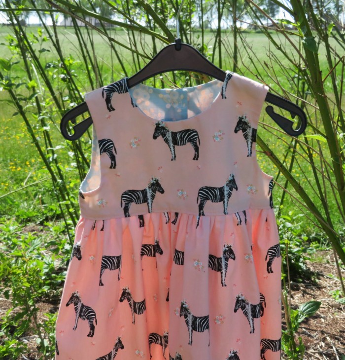 Eenvoudig mouwloos jurkje gemaakt van twee prachtige katoenen stoffen van Soft Cactus.