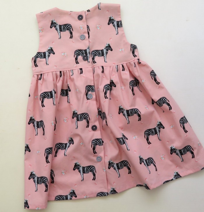 Het bovenpand is gevoerd. Het jurkje sluit met 6 knopen op de rug.
