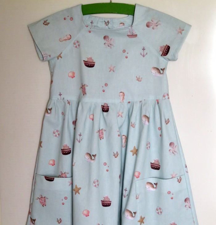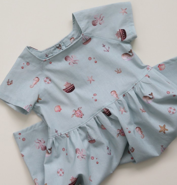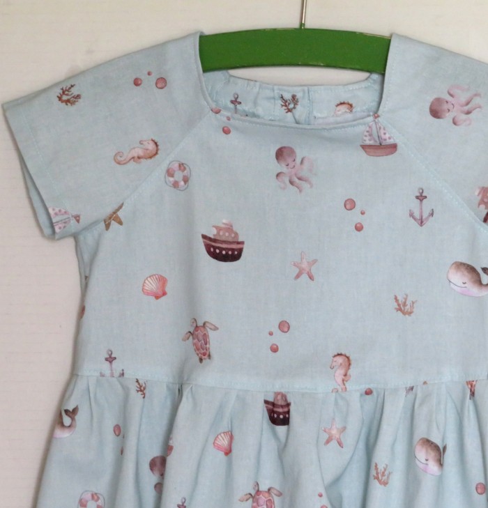 Jurkje maat 92 van poplin katoen met bootjes en zeedieren op een mintgroene ondergrond.