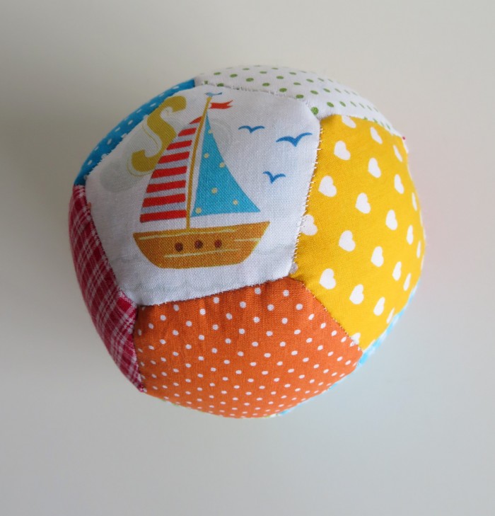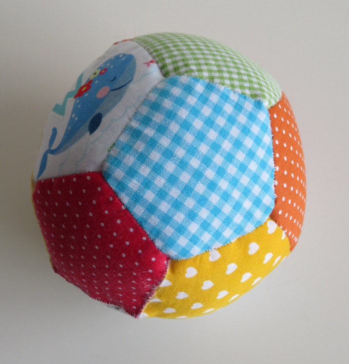 Handgemaakte patchwork rinkelbal in vrolijke kleurtjes.